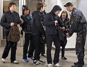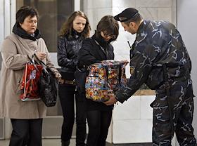 Сотрудник милиции проверяет вещи у пассажиров метро после теракта 11 апреля, Минск, 18 апреля 2011 года.