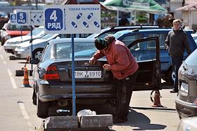 Автомобильный рынок в Ждановичах. Автовладелец заделывает царапины на машине.