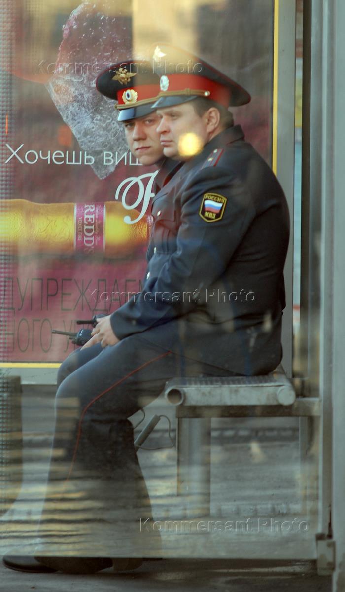 Жанровая фотография. Сотрудники правоохранительных органов на автобусной остановке.
