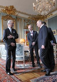 Король Швеции Карл XVI Густав (слева) и председатель правительства России Владимир Путин (справа) во…