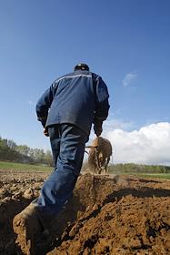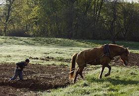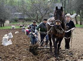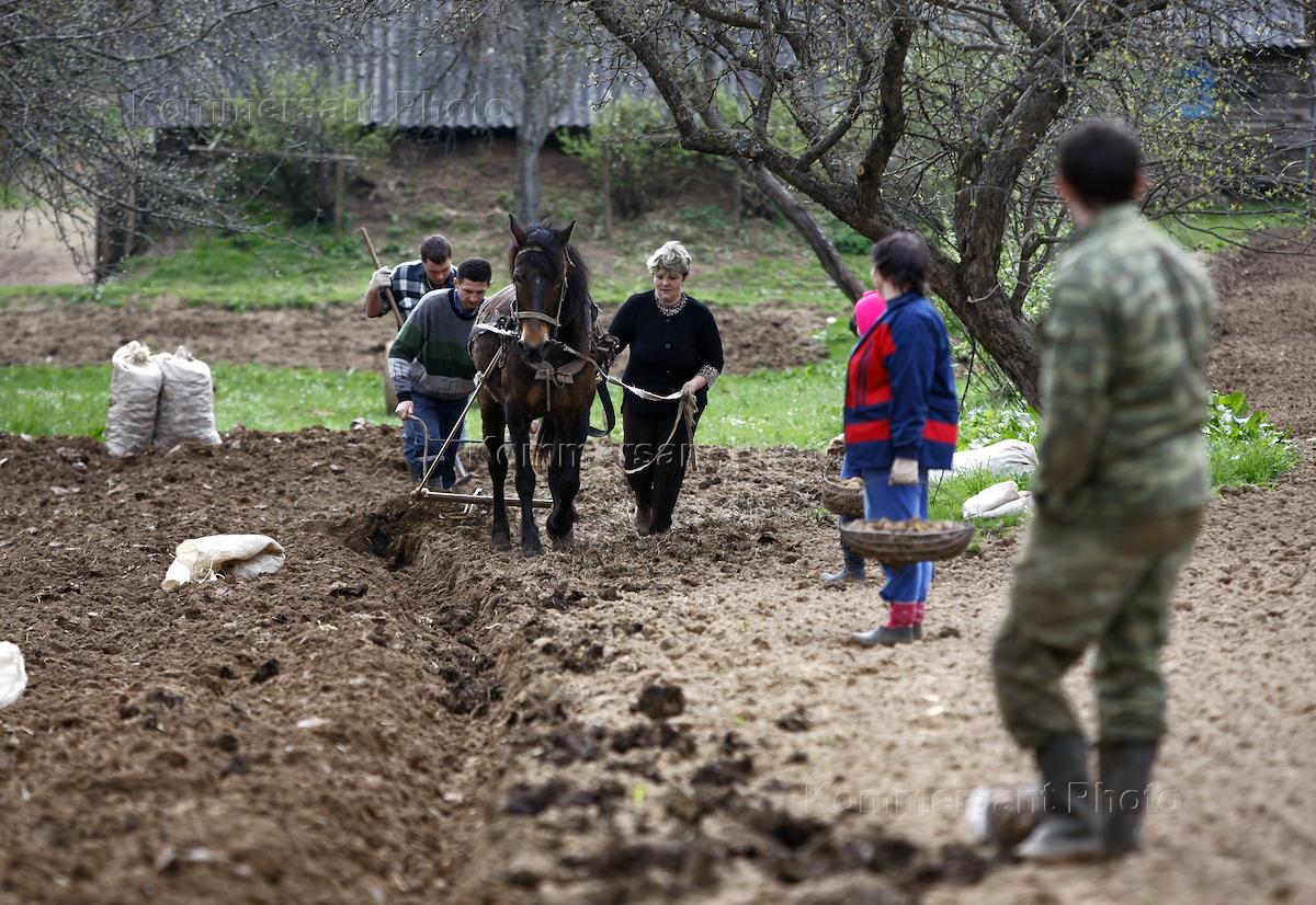 Вспахивание поля с помощью лошади и плуга перед посадкой картофеля жителями Беларуси.