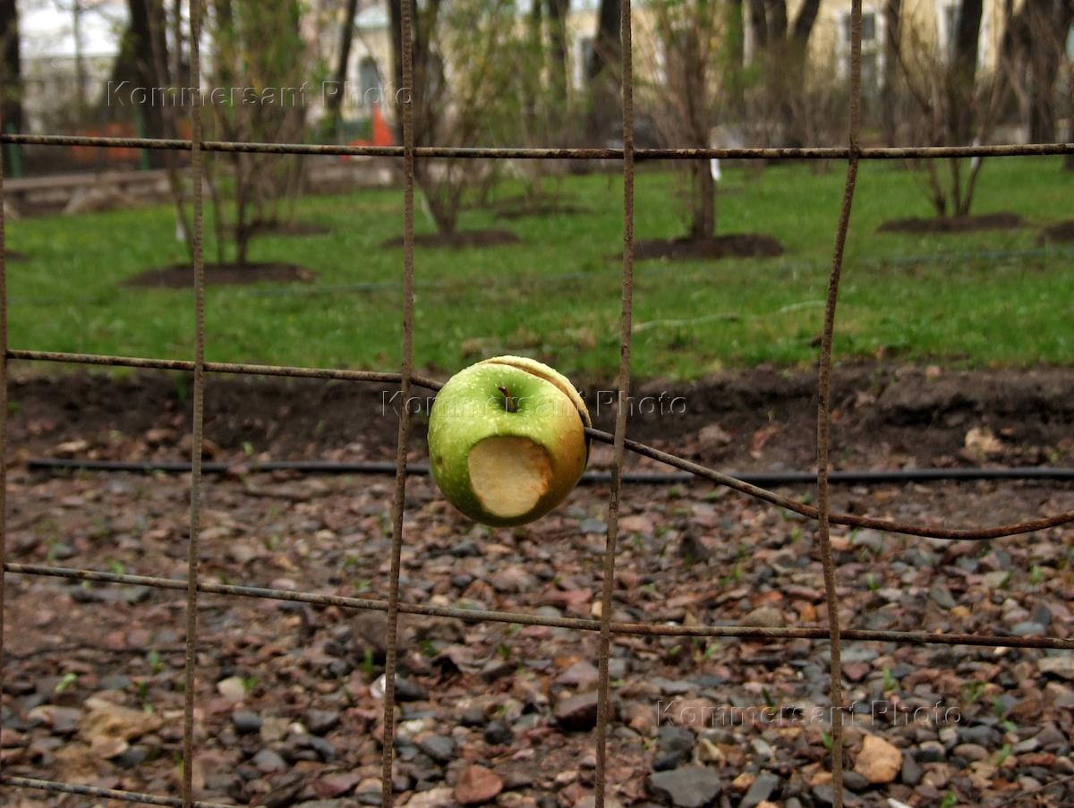 Жанровая фотография. Зеленое надкушенное яблоко в решетке ограждения реконструкции Летнего сада.