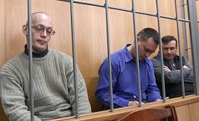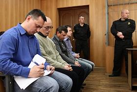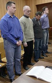 Правосудие Прапорщик Александр Богославский, подполковники Дмитрий Емелин, Сергей Голов, капитан Павел Шуталев, обвиняемые в хищении около 15,9 млн рублей, предназначавшихся для выдачи зарплаты военнослужащим, в зале Екатеринбургского гарнизонного военного суда во время оглашения приговора.