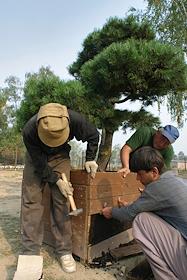 Транспортировка растений для недели садов. Рабочие везут на автокаре горшок с деревом.