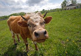 Молодой бычок из личного хозяйства в деревне Виноградовка Липецкой области пасется на лугу.
