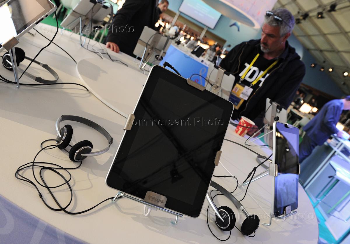 Саммита G8. Пресс-центр саммита. Планшетники с наушниками для работы журналистов.