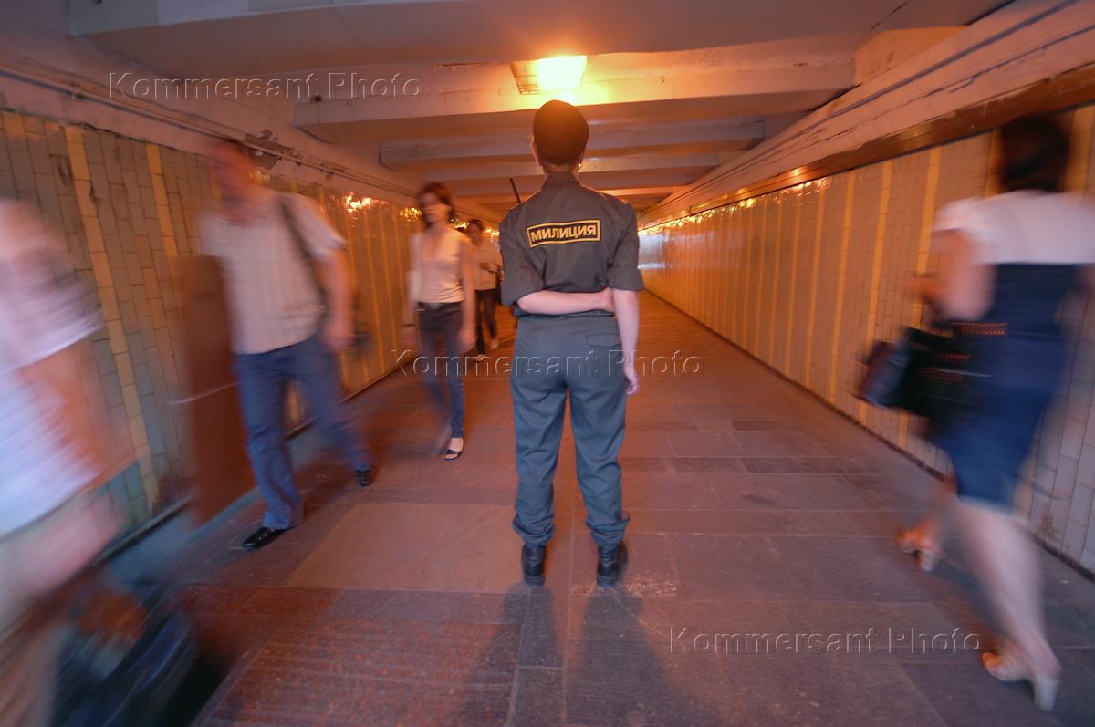 Жанровая фотография. Сотрудник правоохранительных органов во время дежурства в подземном переходе.