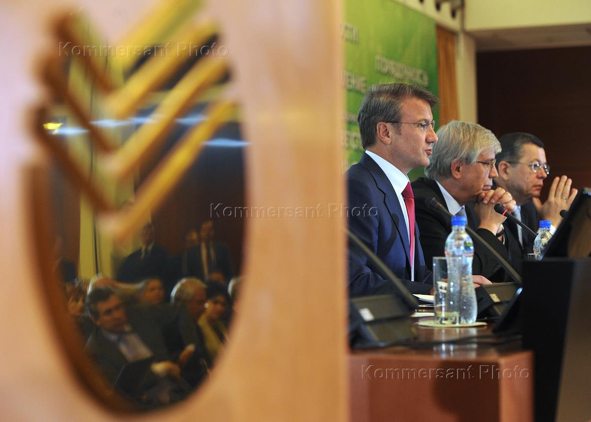 Слева направо: глава Сбербанка России Герман Греф, председатель Центрального Банка России Сергей…