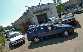 Автомобили в очереди на техническое обслуживание на диагностической станции.