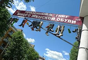 Жанровая фотография. Вывеска обувного магазина "Подземны магнит. Много женской обуви".