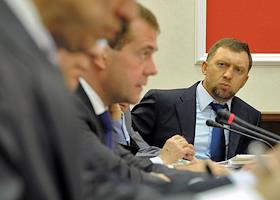 Президент России Дмитрий Медведев (слева) и владелец холдинга "Базовый элемент", генеральный…
