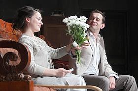 Актеры Сергей Сосновский (слева) и Яна Осипова (справа) во время пресс-показа спектакля "Чайка"…