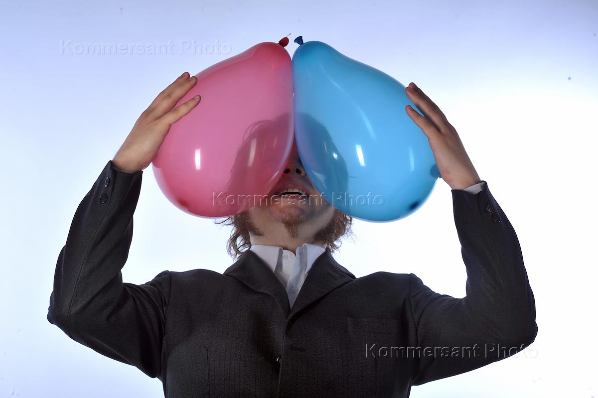 Обложка журнала "Деньги". Жанровая фотография. Мужчина держит розовый и голубой воздушные шары.