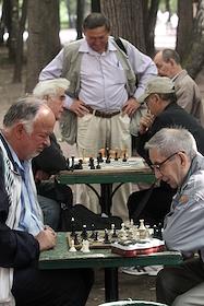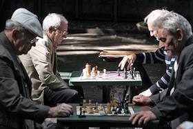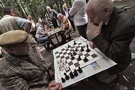 Мужчины играют в шахматы в парке "Сокольники".