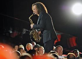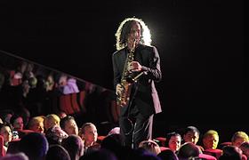 Американский джазовый саксофонист Кенни Джи (Kenny G) во время выступления на сольном концерте в…