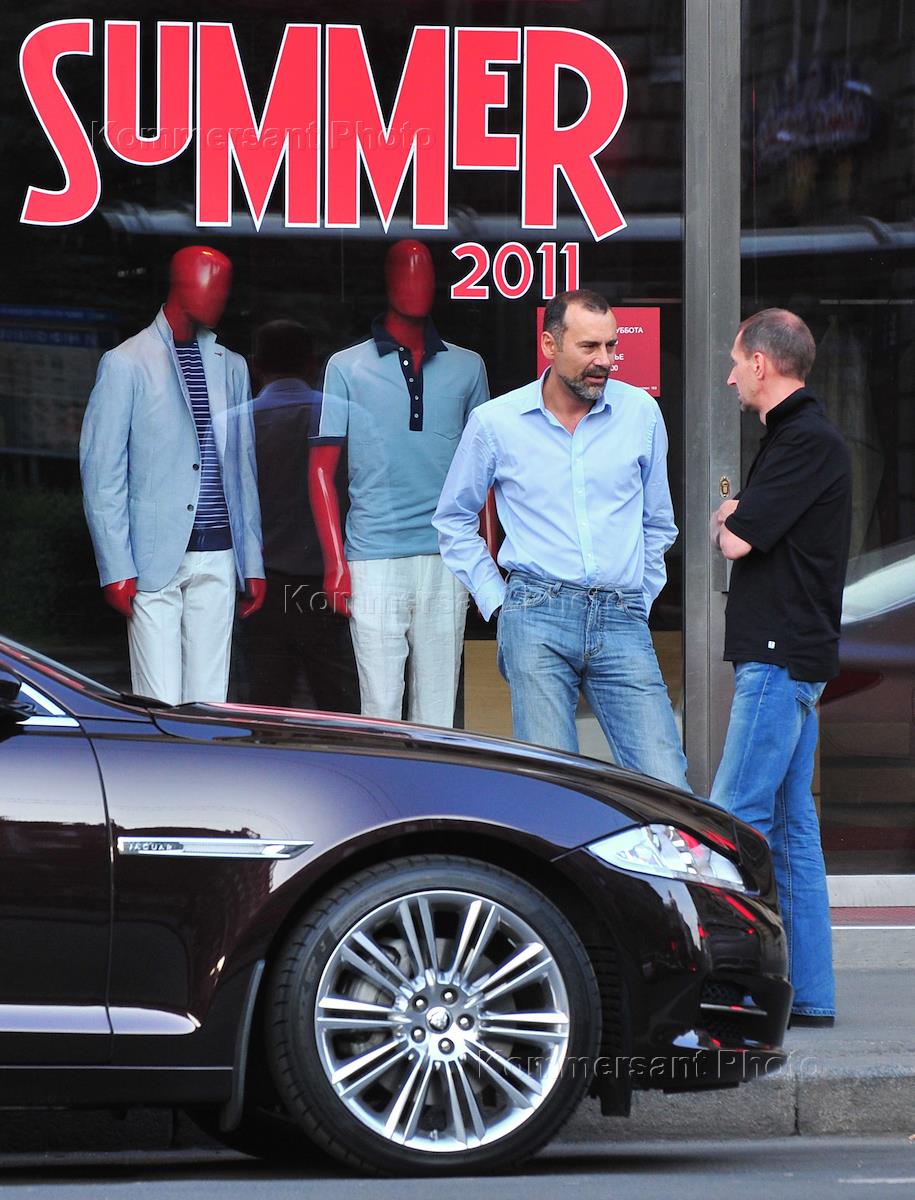 Жанровая фотография. Мужчины разговаривают рядом с магазином мужской одежды.