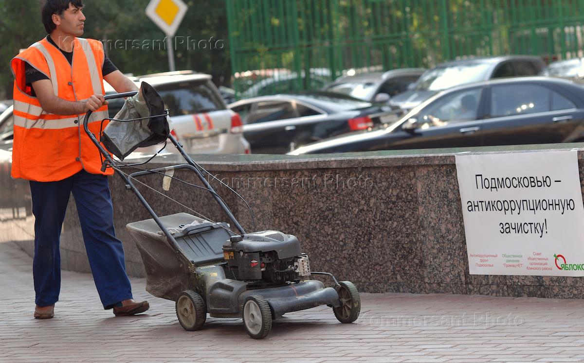 Сотрудник коммунальной службы с газонокосилкой у здания Московской областной думы. Плакат:…