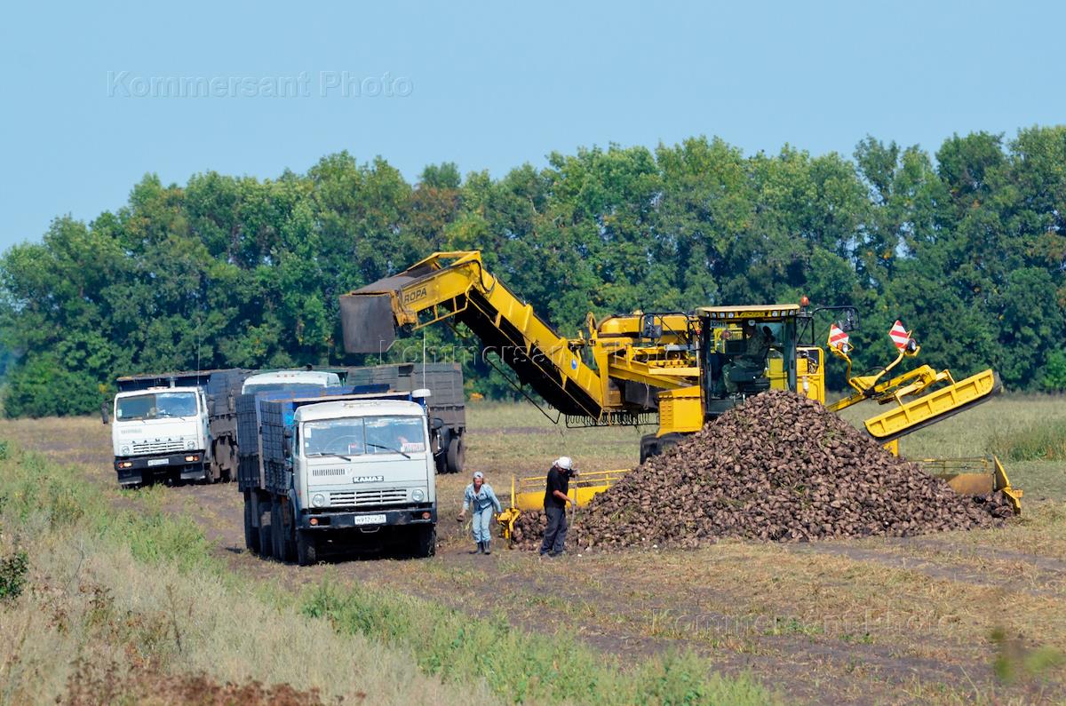 Жанровая фотография. Уборка сахарной свеклы. Сахароуборочный комбайн Bopa засыпает собранные…