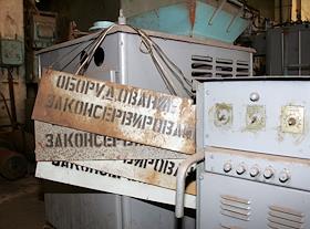 Жанровая фотография. Таблички "Оборудование законсервировано" висят на станках.