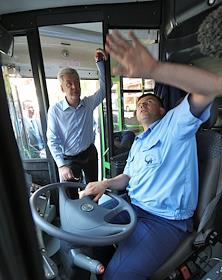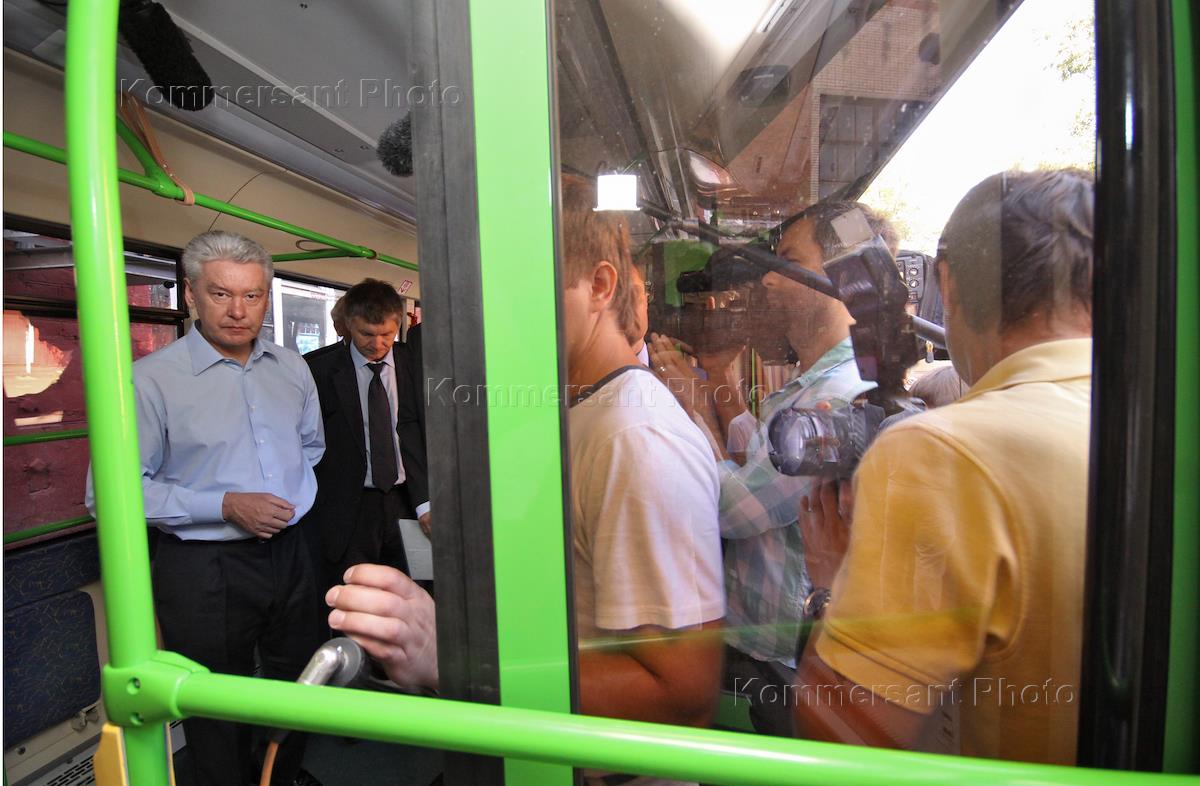 Мэр Москвы Сергей Собянин (слева) во время осмотра нового подвижного состава ГУП "Мосгортранс" на…
