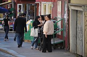 Виды Осло. Женщины стоят у торговых рядов.