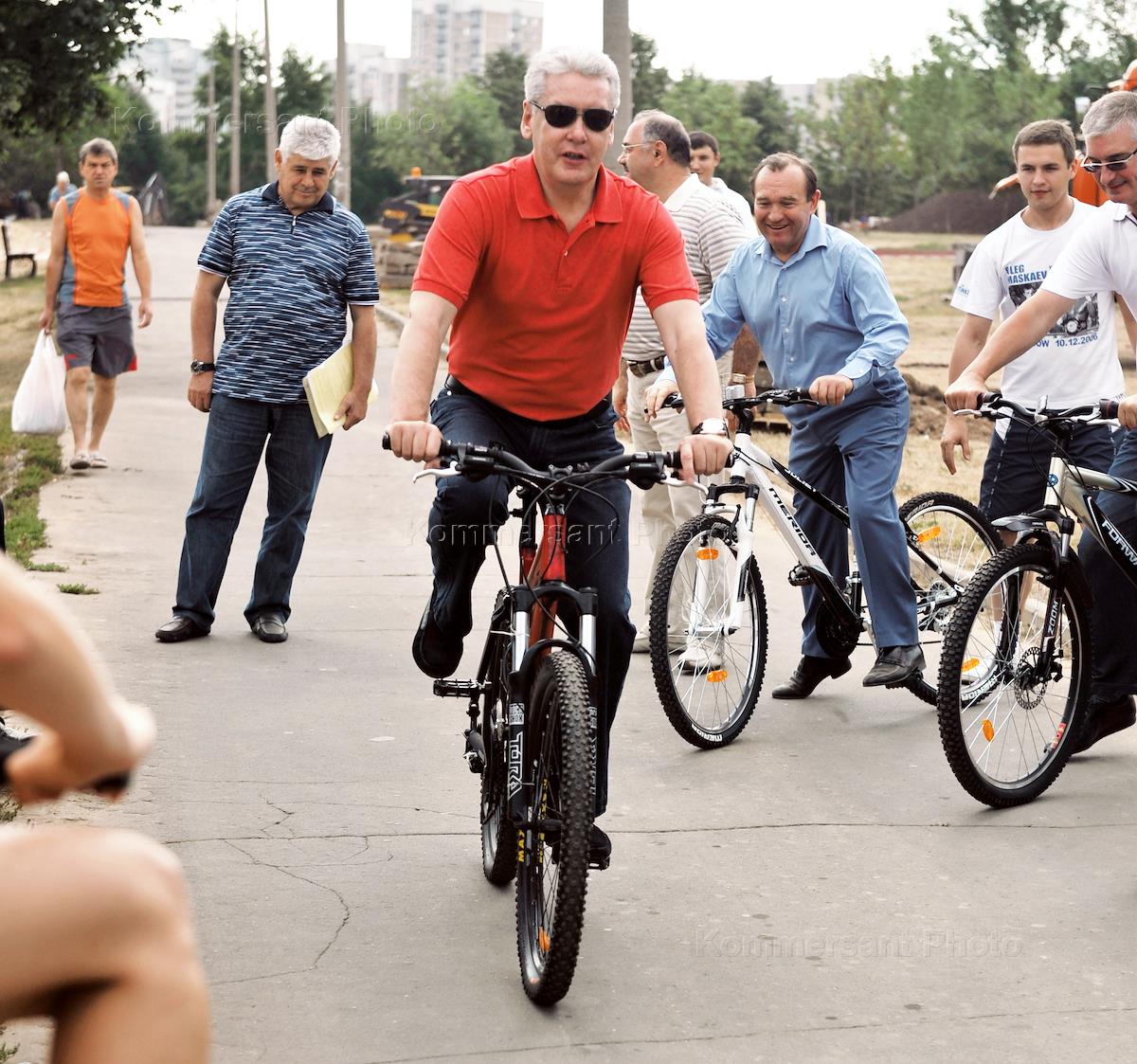 Мэр Москвы Сергей Собянин (в центре) во время посещения парка "Борисовские пруды".