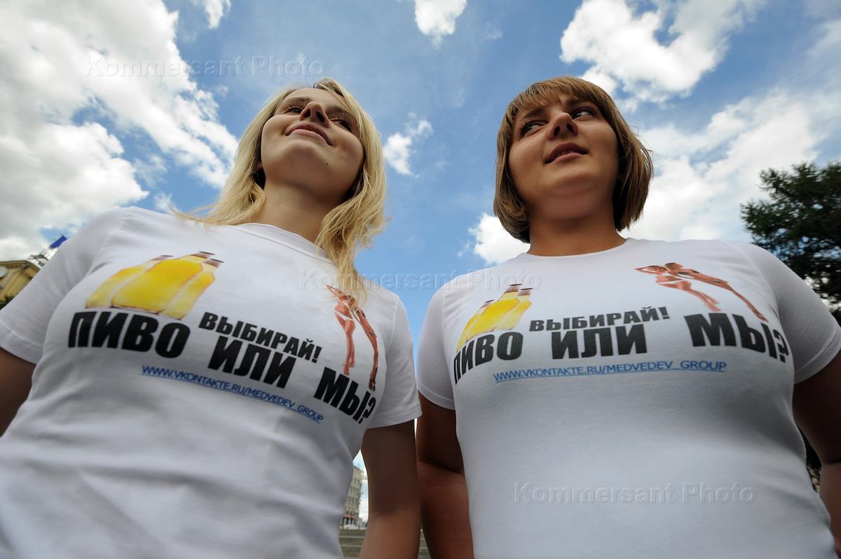 Политика Флэшмоб в поддержку инициатив президента России Дмитрия Медведева в Новопушкинском сквере. Поклонницы Дмитрия Медведева из группы "Медведев – наш президент" социальной сети "ВКонтакте" во время акции в поддержку любителей пива, отказавшихся от него, в Новопушкинском сквере.