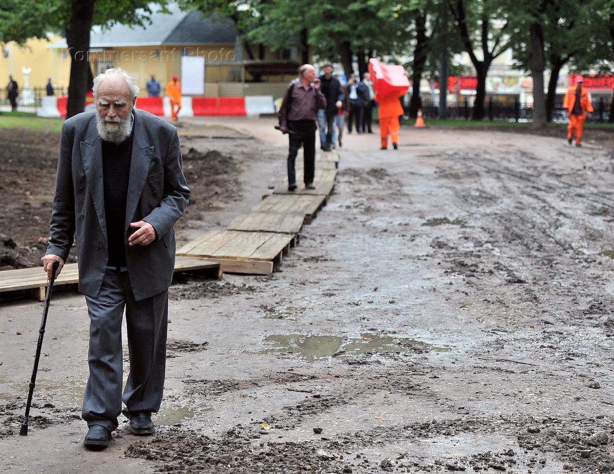 Жанровая фотография. Работы по благоустройству Гоголевского бульвара. Пожилой мужчина идет по…