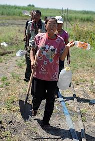 Китайское фермерское хозяйство в Краснодарском крае. Китайские работники возвращаются с поля.