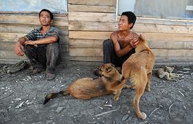 Китайское фермерское хозяйство в Краснодарском крае. Китайский работник с собаками.