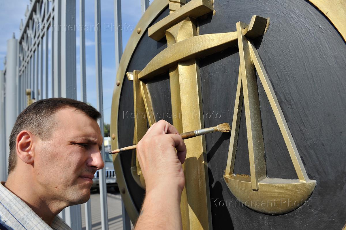Жанровая фотография. Рабочий красит ограду Московского городского суда.