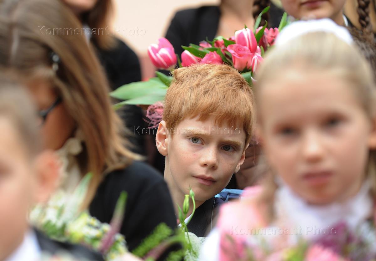 Торжественная линейка, посвященная Дню знаний, в школе-гимназии №1529. Первоклассник с букетом…
