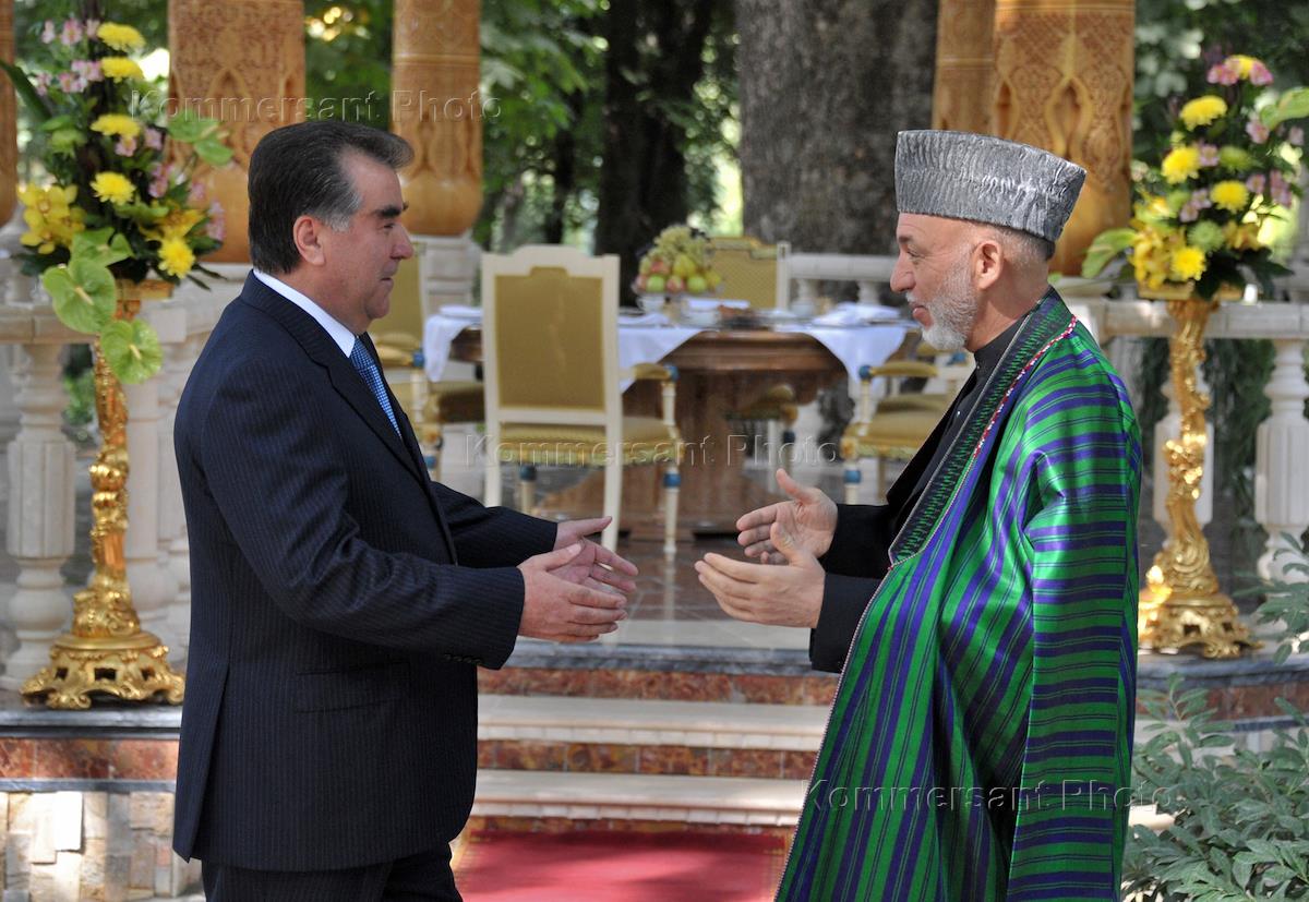 Президент Таджикистана Эмомали Рахмон (слева) и президент Афганистана Хамид Карзай (справа) во время…