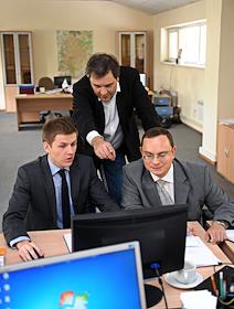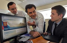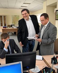 Генеральный директор ОАО "Безоткатные поставки" Константин Чернов (в центре) в офисе с сотрудниками…
