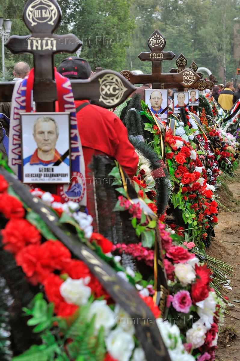 Светская жизнь Прощание с погибшими в результате катастрофы самолета Як-42 7 сентября хоккеистами ярославского "Локомотива", в ледовом доврце спорта "Арене 2000", в Ярославле. Траурный митинг. Похороны на Леонтьевском кладбище.