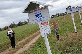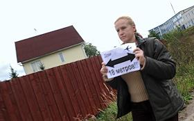 Населенный пункт Дубровки. Женщина держит плакат с указанием расстояния в 18 метров между самолетами…