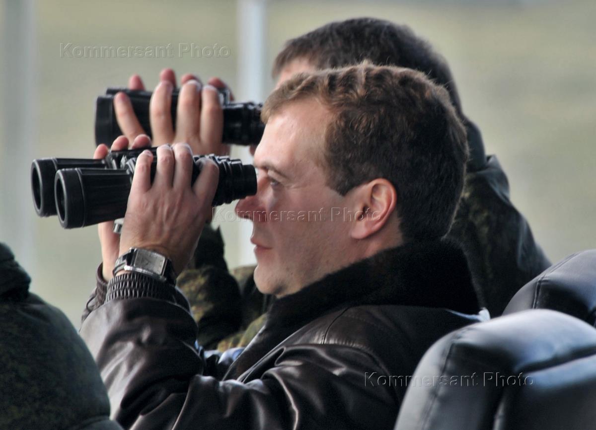 Президент России Дмитрий Медведев во время посещения полигона Чебаркуль, где проходит завершающий…
