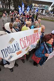 Участница акции движения "Старшее поколение" разрывает сберегательную книжку Сбербанка. Акция прошла…