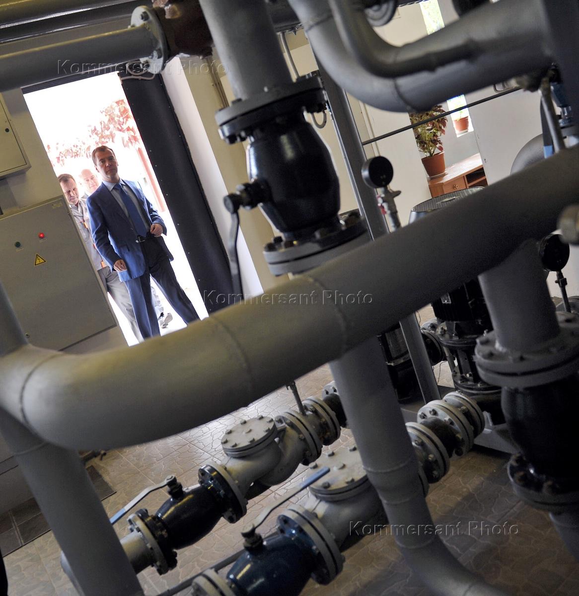 Президент России Дмитрий Медведев (справа) во время осмотра модульной газовой котельной №1.