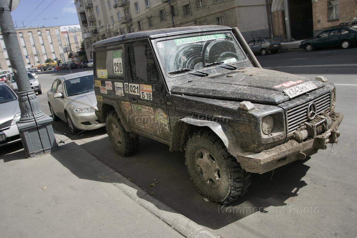 Жанровая фотография. Грязный внедорожник припаркованный у тротуара.