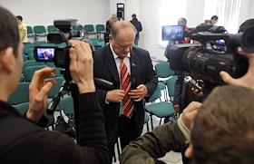 Лидер Коммунистической партии России (КПРФ) Геннадий Зюганов (справа) на пресс-конференции в…