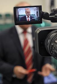 Руководитель фракции КПРФ в Московской городской думе Андрей Клычков на пресс-конференции в…