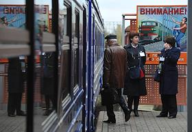 Пассажиры на Савеловском вокзале у входа к электропоезду "РЭКС", следующего по направлению…