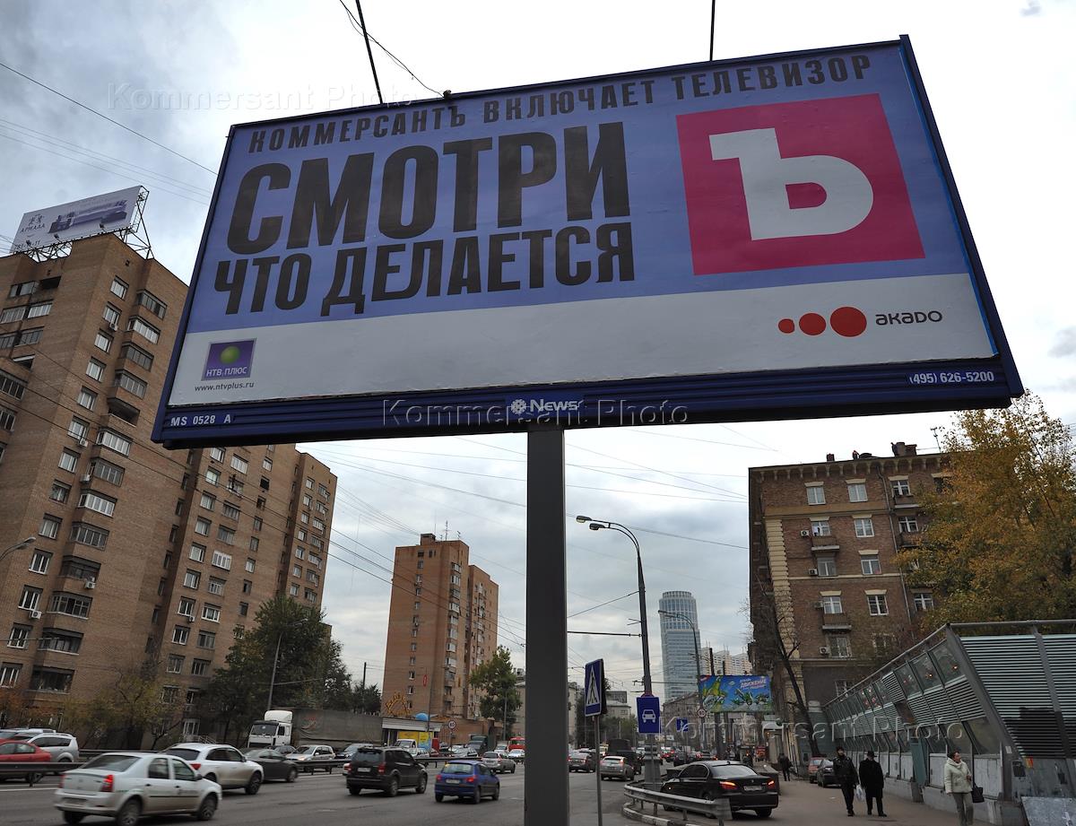 Виды Москвы. Жилой дом по адресу улица Беговая, 28. Рекламный щит "Коммерсантъ включает телевизор.…
