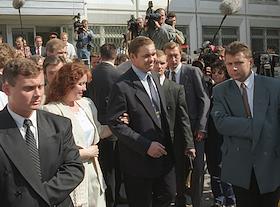 Генерал Александр Лебедь с супругой во время президентских выборов направляются к избирательному…