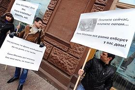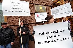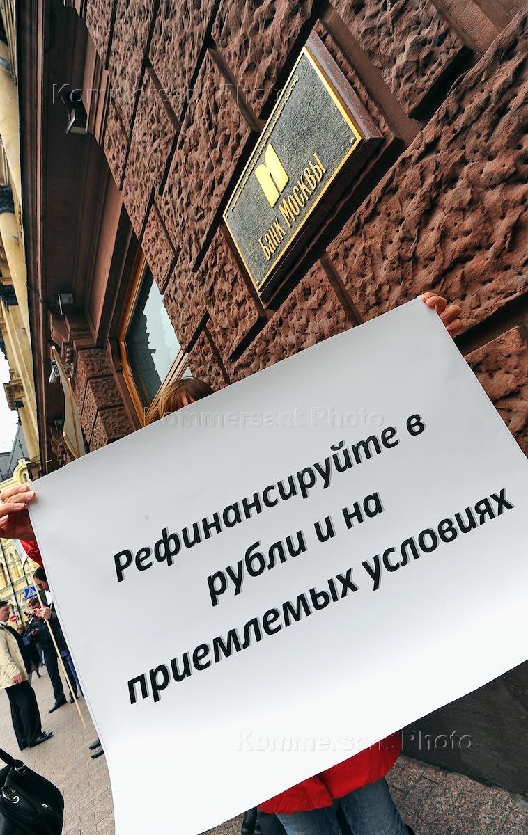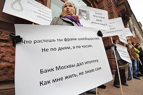 Экономика и бизнес Пикет с требованием принятия руководством ОАО "Банк Москвы" оперативных мер, направленных на снижение долговой нагрузки заемщиков ОАО "Банк Москвы" по ипотечным кредитам в швейцарских франках и японских йенах возле "Банка Москвы".