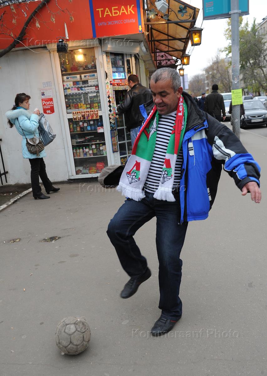 Жанровая фотография. Мужчина с шарфом футбольного болельщика команды "Локомотив" играет в мяч на…