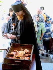 Скит во имя Всех Святых на острове Валаам. Монах раздает угощение паломникам по случаю дня Всех…