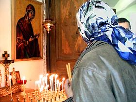 Скит во имя Всех Святых. Паломница ставит свечи перед иконой Богородицы.