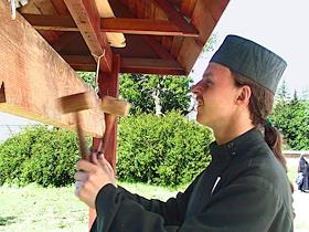 Скит во имя Всех Святых. Послушник-пономарь бьет в било (деревянная доска), созывая монахов к…